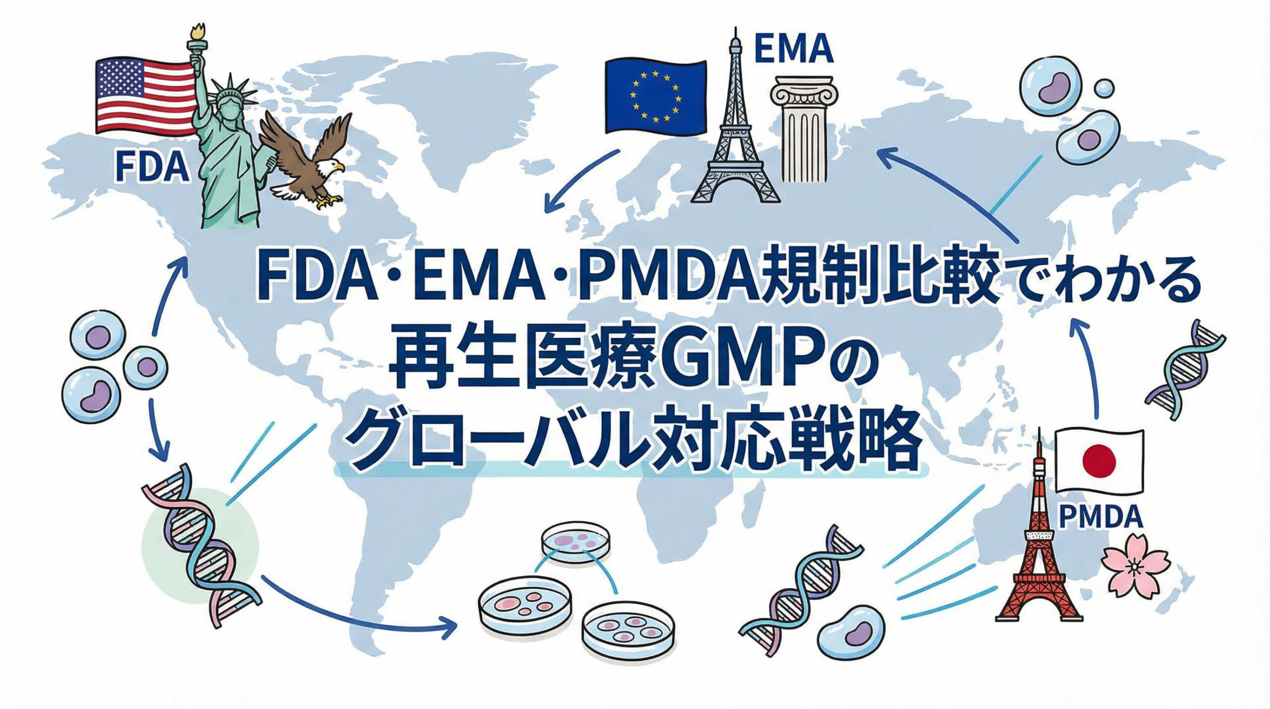 このような不安をお持ちの方も多いのではないでしょうか。本記事では、再生医療分野における海外GMP規制との比較(FDA・EMA・PMDA)をテーマに、実務レベルで押さえておくべき主要なギャップと、それらを乗り越えるための具体的な戦略を解説します。3極の規制を俯瞰し、手戻りのないグローバル製造体制を構築するための一助となれば幸いです。